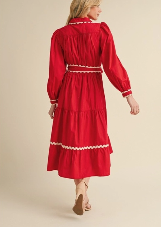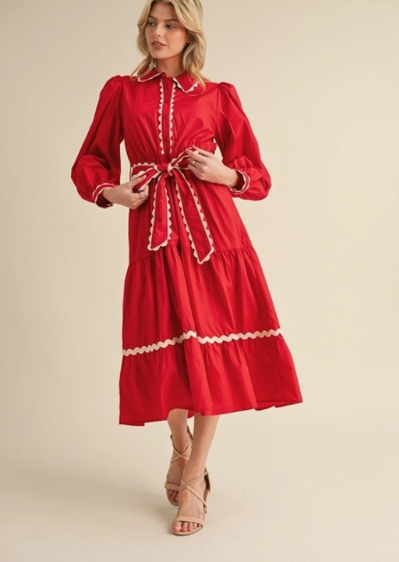 This bright red dress it a showstopper and perfect for the holidays. The scalloped trim lining the collar, sleeve and skirt hem give a sweet retro touch. THe flowy mid-length and tiered skirt add a soft and romantic feel, while the belted waist ties everything together in a figure-flattering bow. It's bold, fun and timelessly elegant.