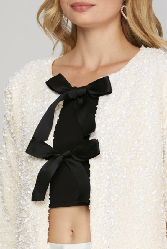 This jacket is all about contrast and fun. The jacket is sparking, covered in sequins that shimmer with every move. The black bows accent this jacket without overpowering the sequins. This is the kind of jacket that says, "I'm here to sparkle." It's cute, classy and oh-so-fun.